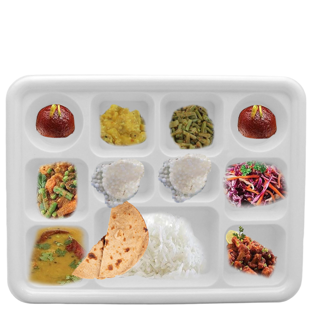 - The multiple compartments of this plate holds soup, sauce, chutney, curries etc very well. An ideal solution for your gathering, whether it’s picnic, BBQ, reunion, Christmas, Thanksgiving or casual wedding reception. Our disposable party thali plates are in classic white the ultimate choice for versatile and elegant party tableware, Perfect for any occasion, these multi-compartment serving plates offer convenient dining solutions and efficient food organizations and making them ideal for large gatherings.